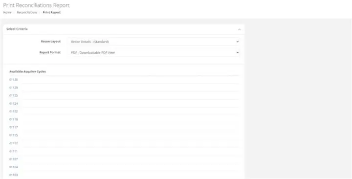 Purpose - To View / Print / Save reconciliation files for a specific acquirer cycle / settlement period in the following file formats: