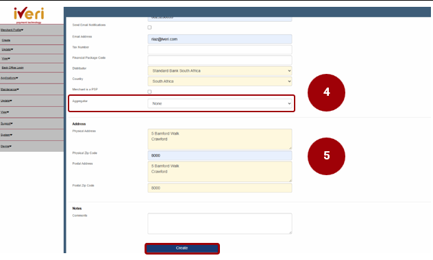 Once the user has captured the address of the Merchant, click on the ‘Create’ tab.