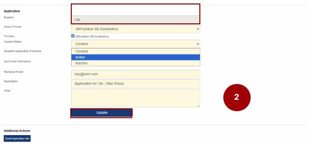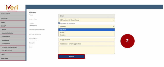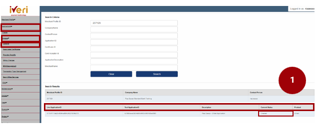 The user will be able to set applications that have been created to Active status including changing a merchant’s application that has been suspended due to inactivity, can be changed here.