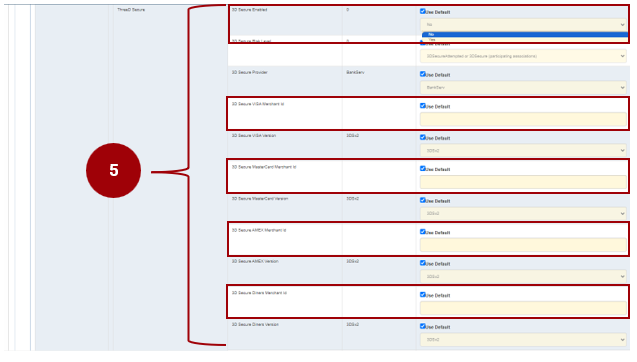 3DS Secure Enabled: Untick default and change drop down to Yes