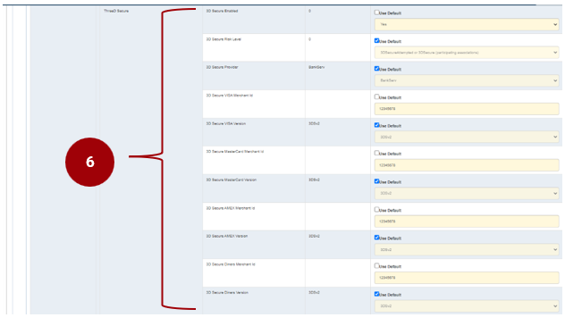 4. From the ‘ThreeD secure Parameter’ the user can now enable and configure 3D Secure for each Card scheme applicable to the merchant in accordance with the merchant agreement.