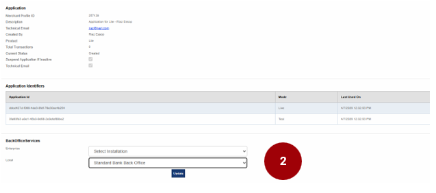 4. This Merchant page will appear. Click on ‘Update’ to sync the new application to BackOffice for this Merchant.