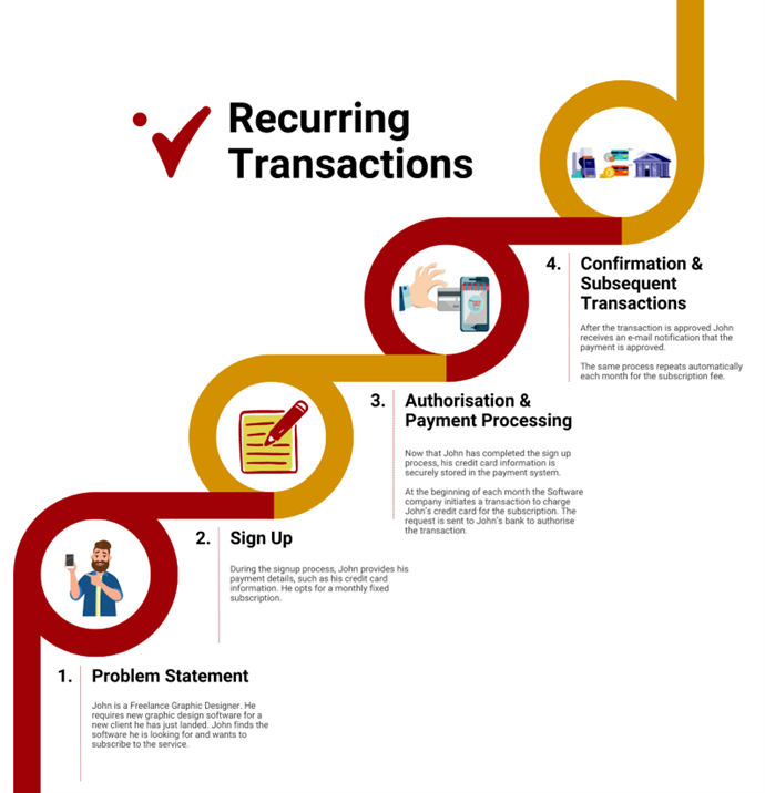 Recurring transactions refer to payments or financial transactions that occur on a regular, predetermined schedule. These transactions are typically set up to recur automatically without the need for manual intervention for each occurrence. The frequency of the transactions is predetermined and agreed upon by the parties involved.