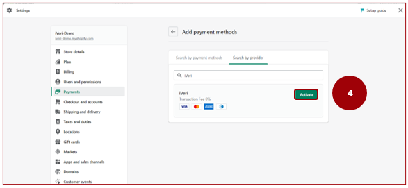 4. Once the Merchant has searched for iVeri as their payment provider, clicking on the ‘Activate’ tab.