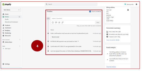 From the timeline, the Merchant is able to track every action that has taken place on a specific order.