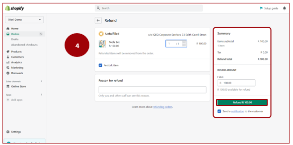 Note: It is important that you tick the box to send a notification to the customer relating to the refund.