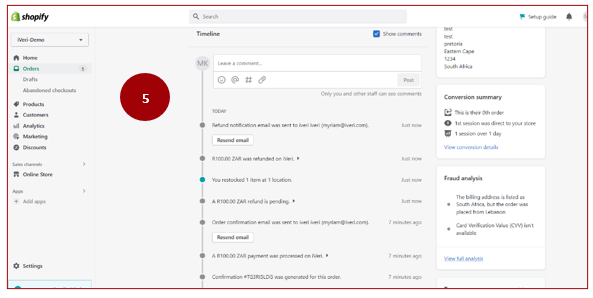 5. All updates and actions will reflect on the Order timeline for the Merchant to track.