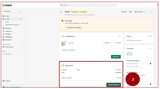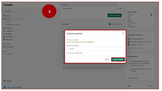 3. Here the Merchant is able to capture payment and set the amount that needs to be captured.