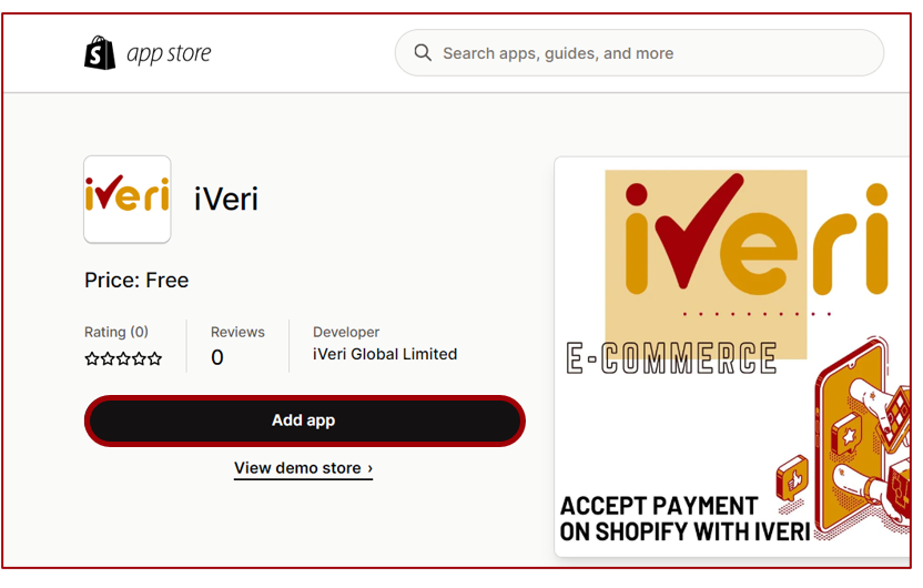 The Merchant can access the following link in order to install the iVeri Payment application: https://apps.shopify.com/iveri